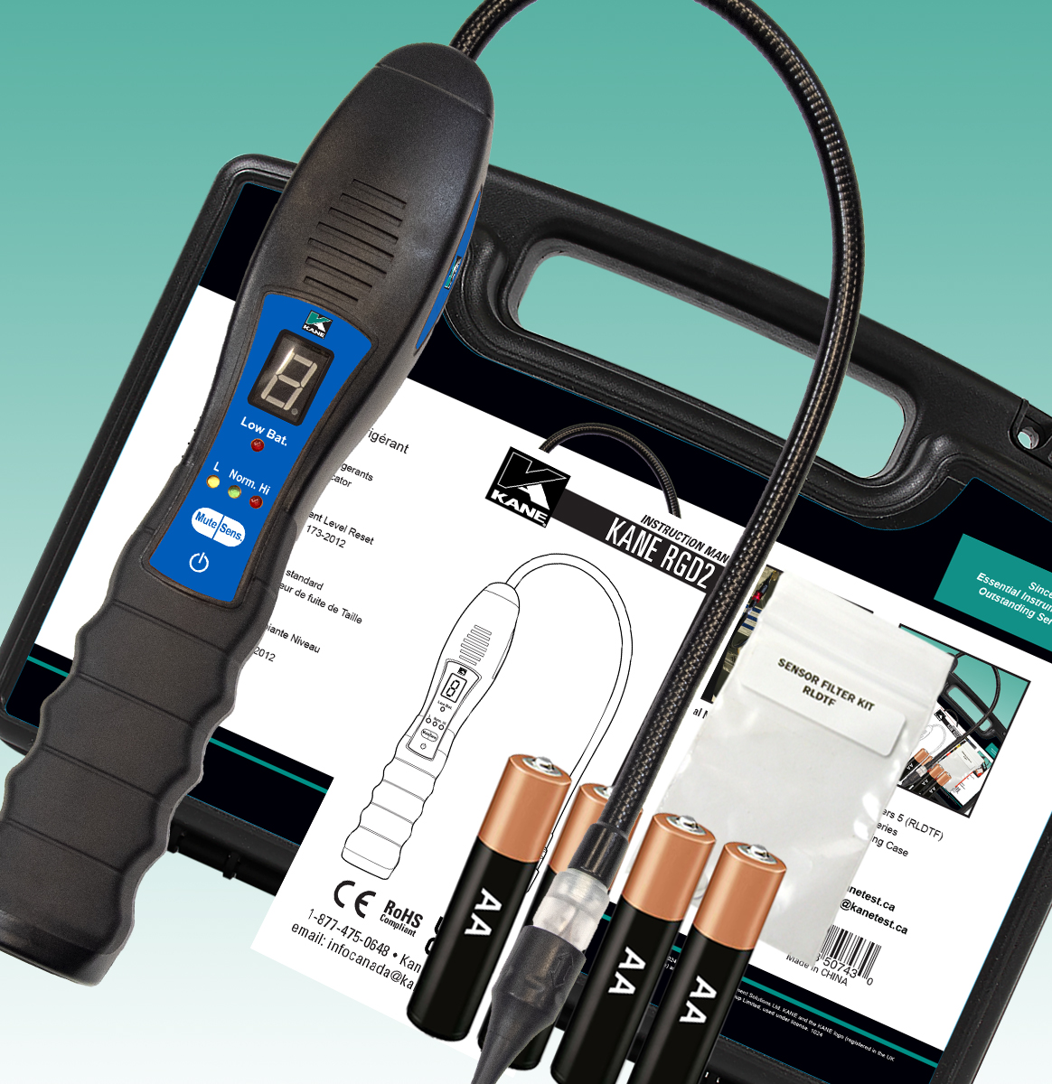 Refrigerant Leak Detector A2L certified for flammable refrigerants. Detects over 85 industry standard refrigerants. with flexible goose neck probe, audible tick rate & LED alarm indication supplied with 5 RLDTF sensor filters, 4 AA batteries, manual & hard carry case